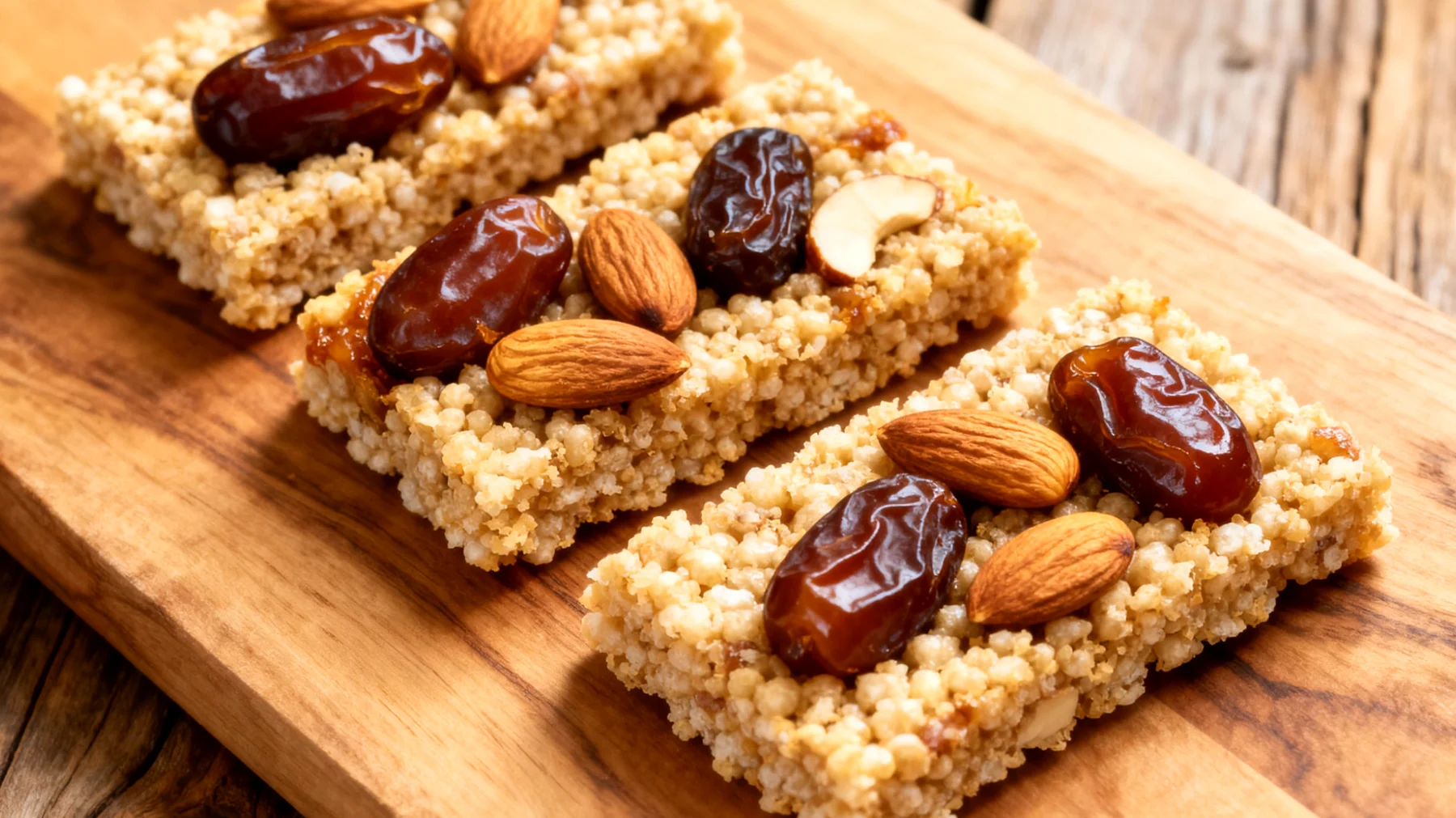 Hausgemachte Riegel haben den Vorteil vollständiger Kontrolle über die Zutaten. Die Herstellung ist unkompliziert: Gepuffter Amaranth, gehackte Mandeln und pürierte Datteln werden vermischt, in eine Form gepresst und im Kühlschrank fest werden gelassen. Ohne Backen, ohne zugesetzten Zucker, ohne Konservierungsstoffe.