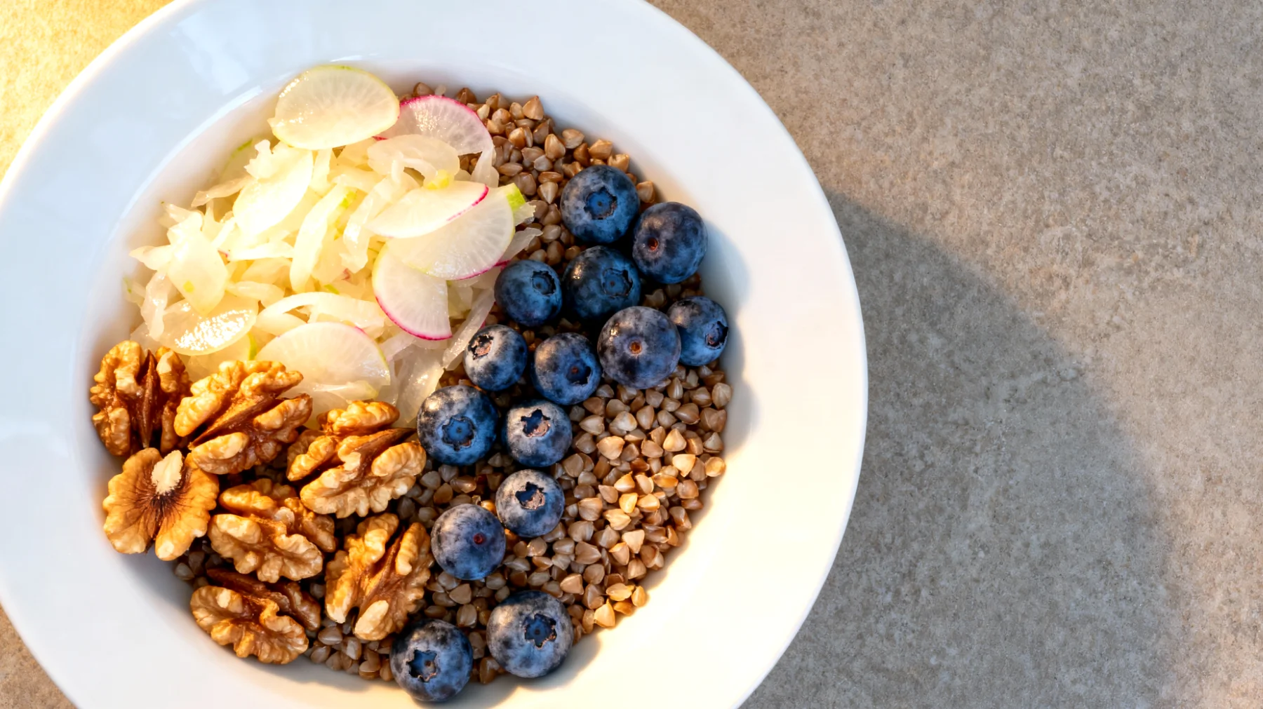 Was diese Bowl besonders macht, ist das Zusammenspiel der Komponenten. Die Omega-3-Fettsäuren aus den Walnüssen verbessern die Aufnahme fettlöslicher Antioxidantien aus den Blaubeeren. Die B-Vitamine aus dem Buchweizen arbeiten mit dem Magnesium zusammen, um Neurotransmitter zu synthetisieren. Das Eisen unterstützt den Sauerstofftransport zum Gehirn, während die Probiotika aus den fermentierten Rüben die Nährstoffaufnahme im Darm optimieren.